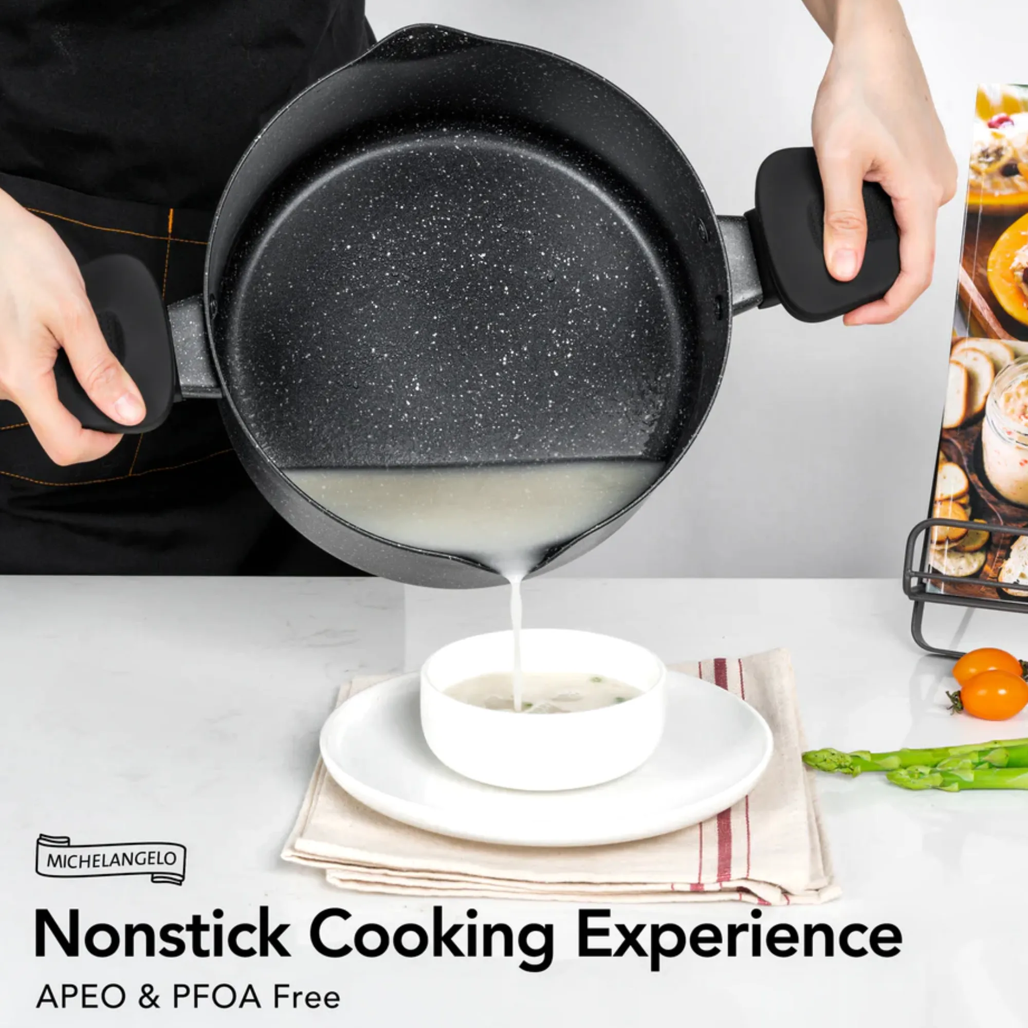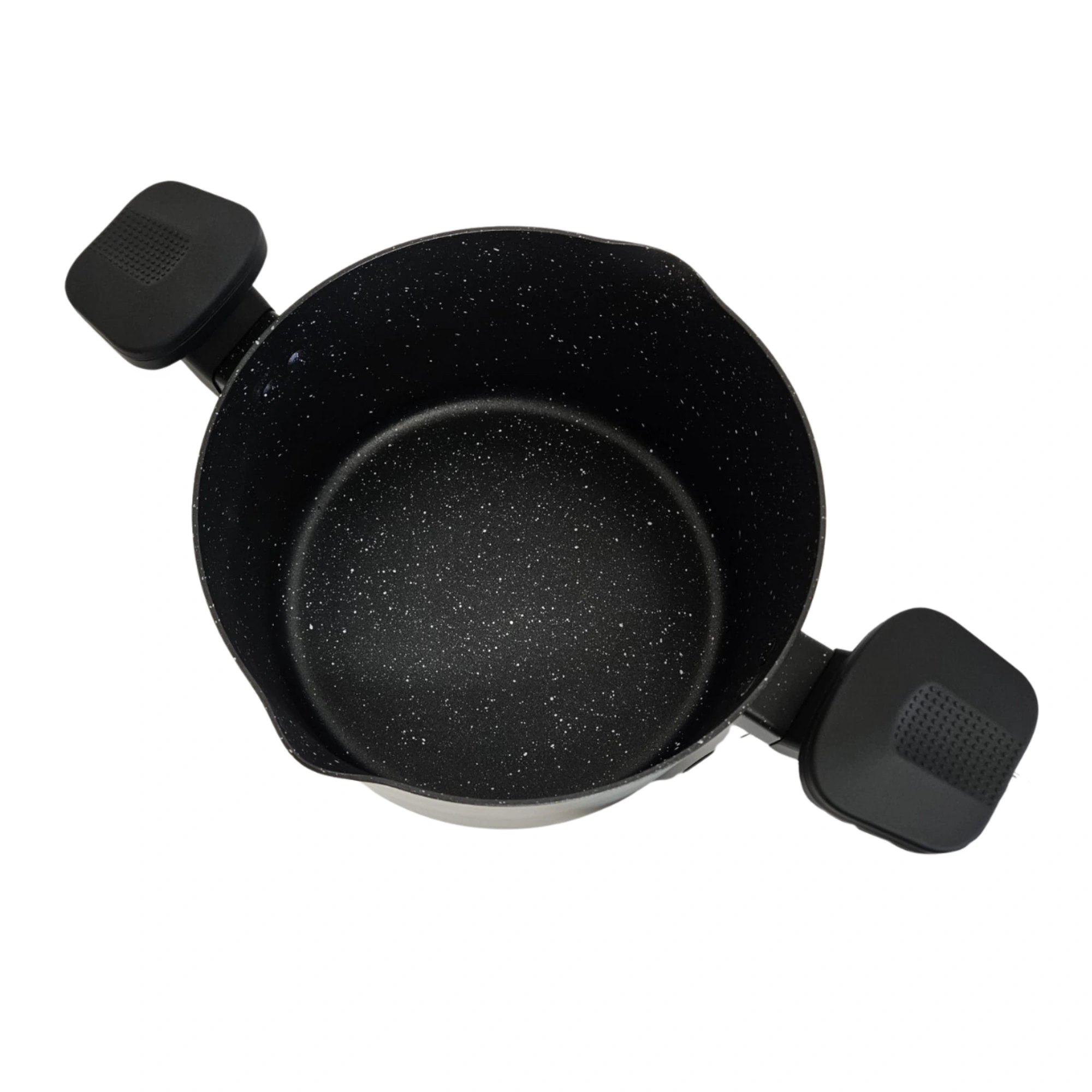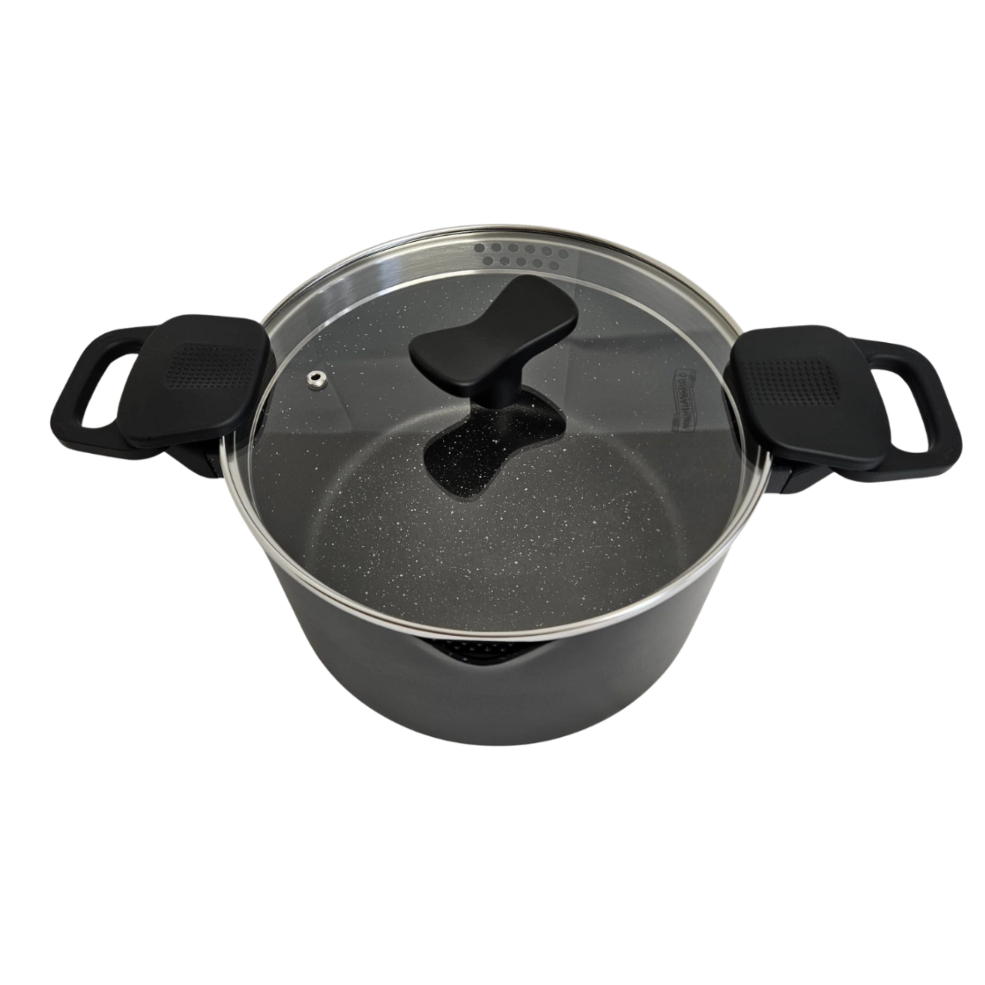 | Kenmerken en afmetingen | Inhoud 6 liter – ideaal voor pasta en soep Afgietdeksel met dubbele zeefstand Twist-to-lock handgrepen voor veilig afgieten Slijtvaste graniet antiaanbaklaag (vrij van APEO & PFOA) Geschikt voor alle warmtebronnen (incl. inductie) Ergonomische, hittebestendige handgrepen |