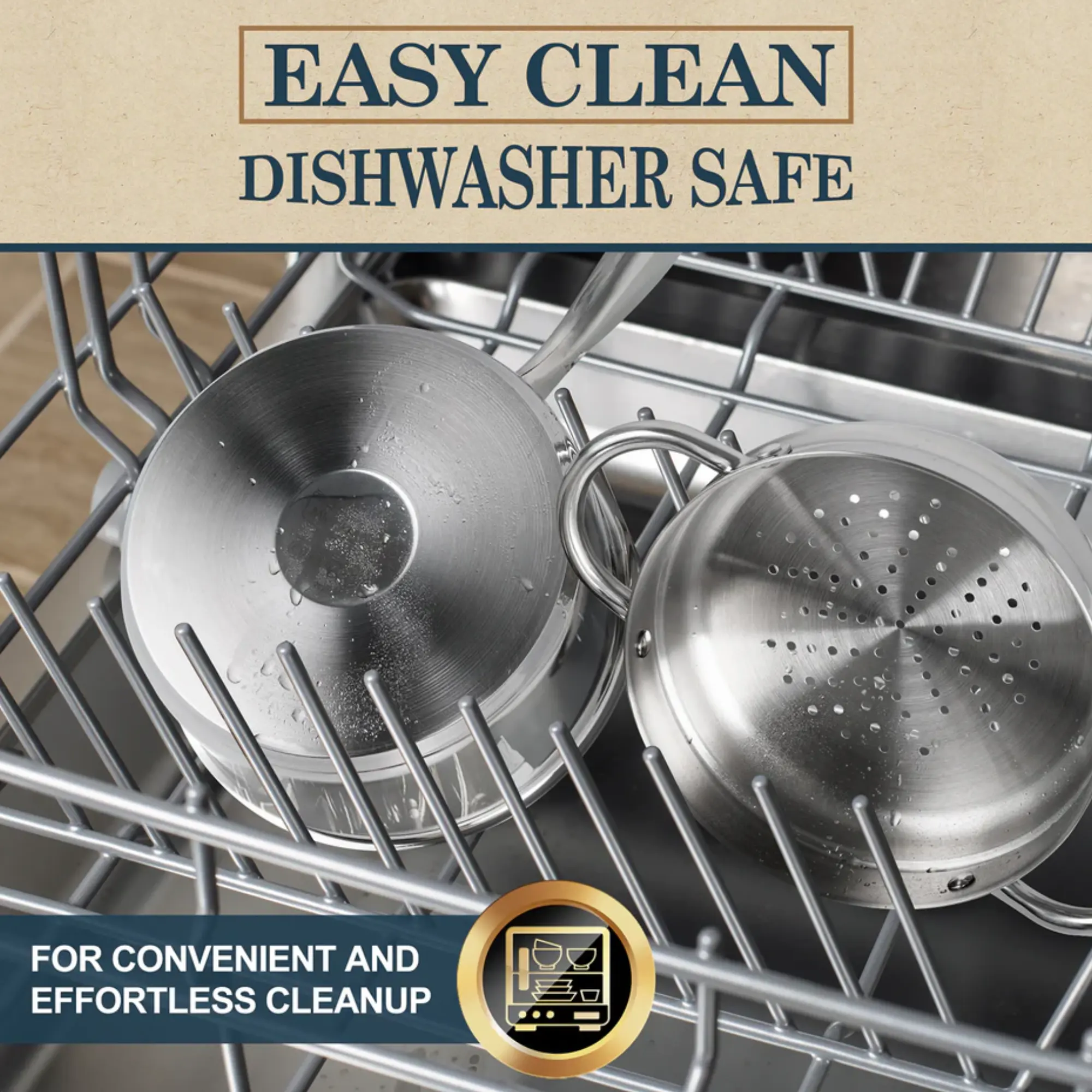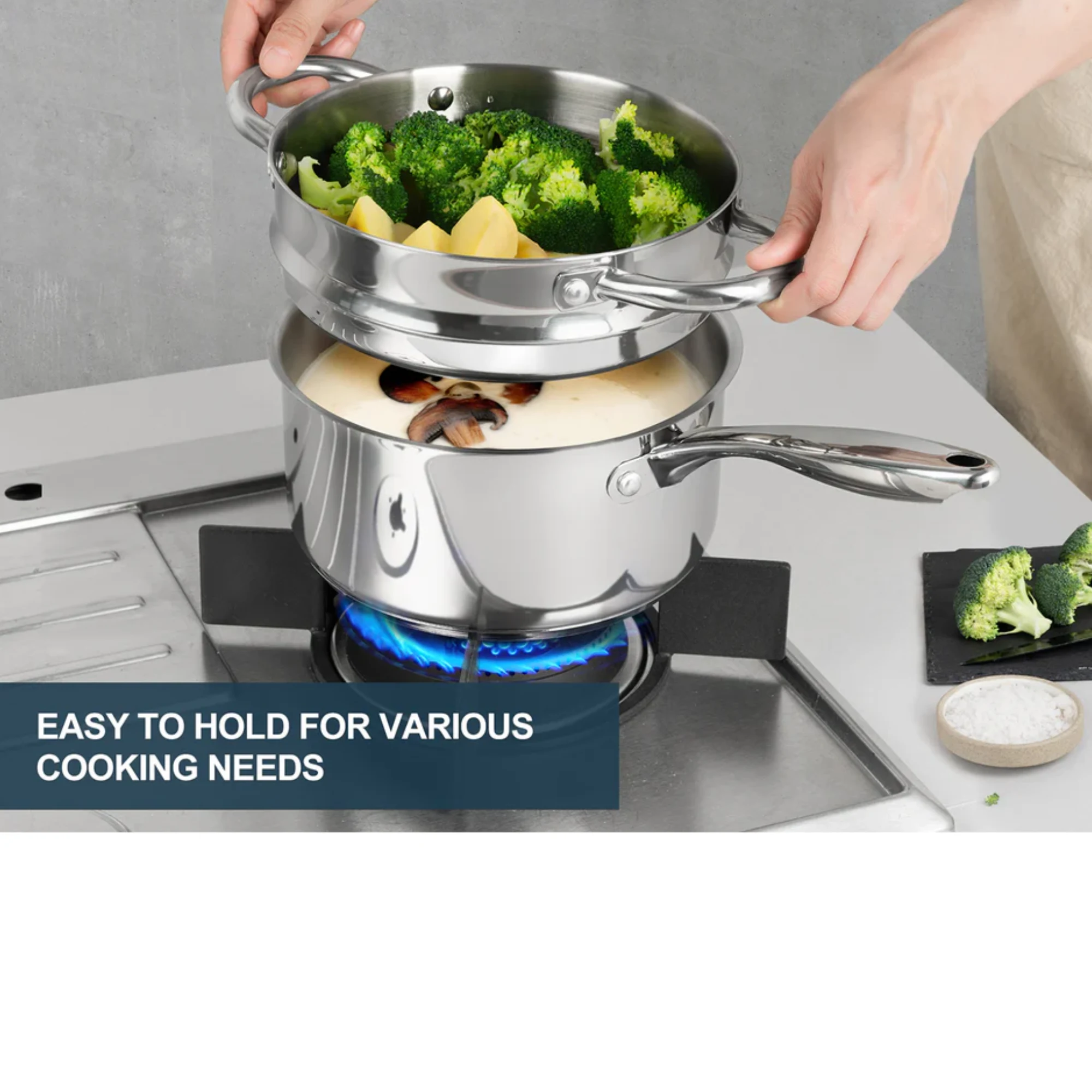 De pan is gemaakt van hoogwaardig 304 food-grade RVS en heeft een drielaagse bodem die zorgt voor een gelijkmatige warmteverdeling over het hele oppervlak. Dit voorkomt aanbranden en zorgt voor een constante temperatuur tijdens het koken of stomen.