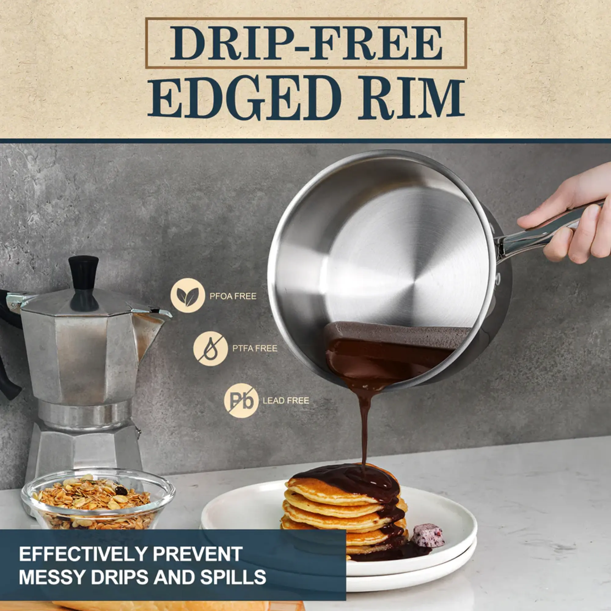 Het glazen deksel houdt stoom, smaak en voedingsstoffen vast, terwijl de uitlopende rand zorgt voor morsvrij schenken – ideaal voor sauzen en bouillons.