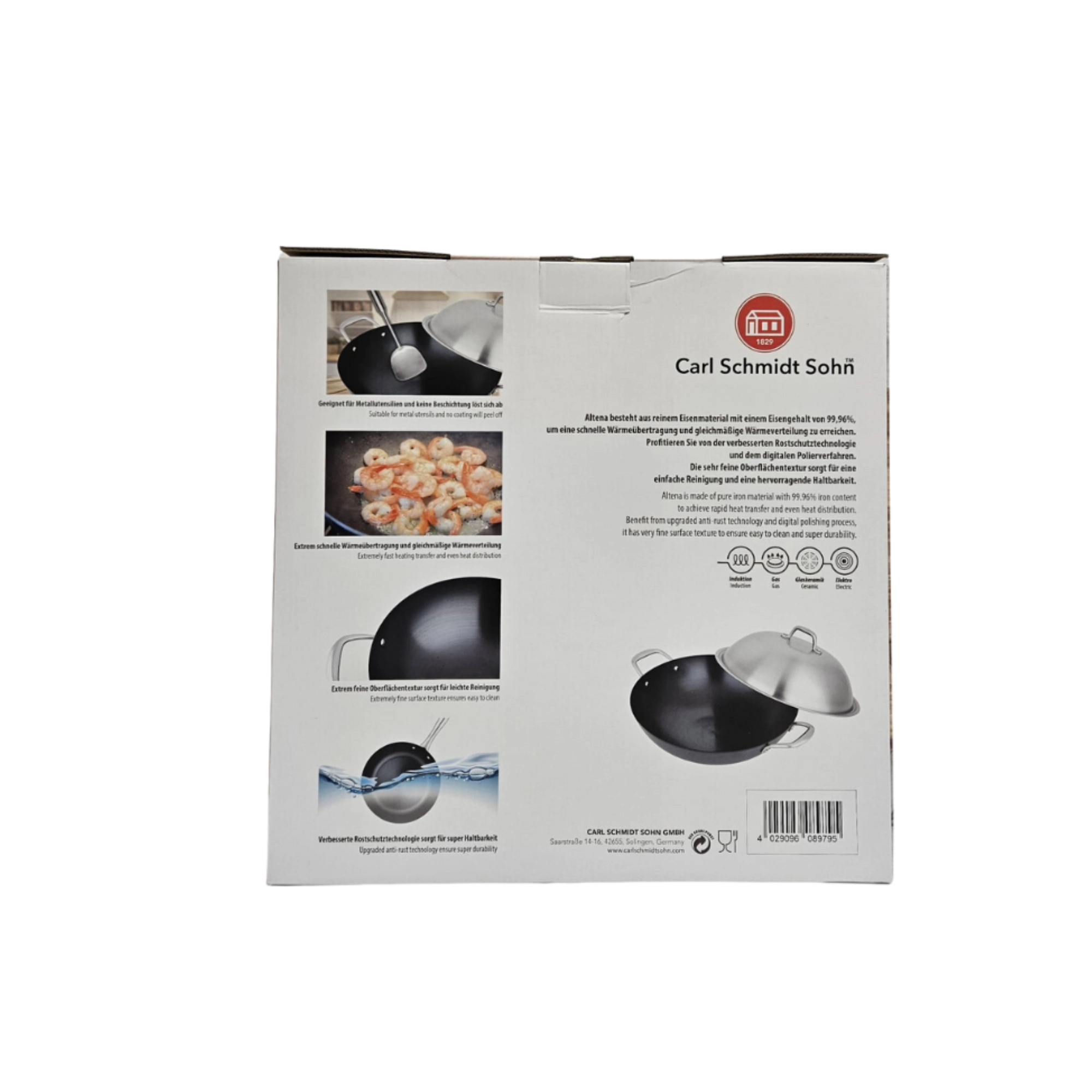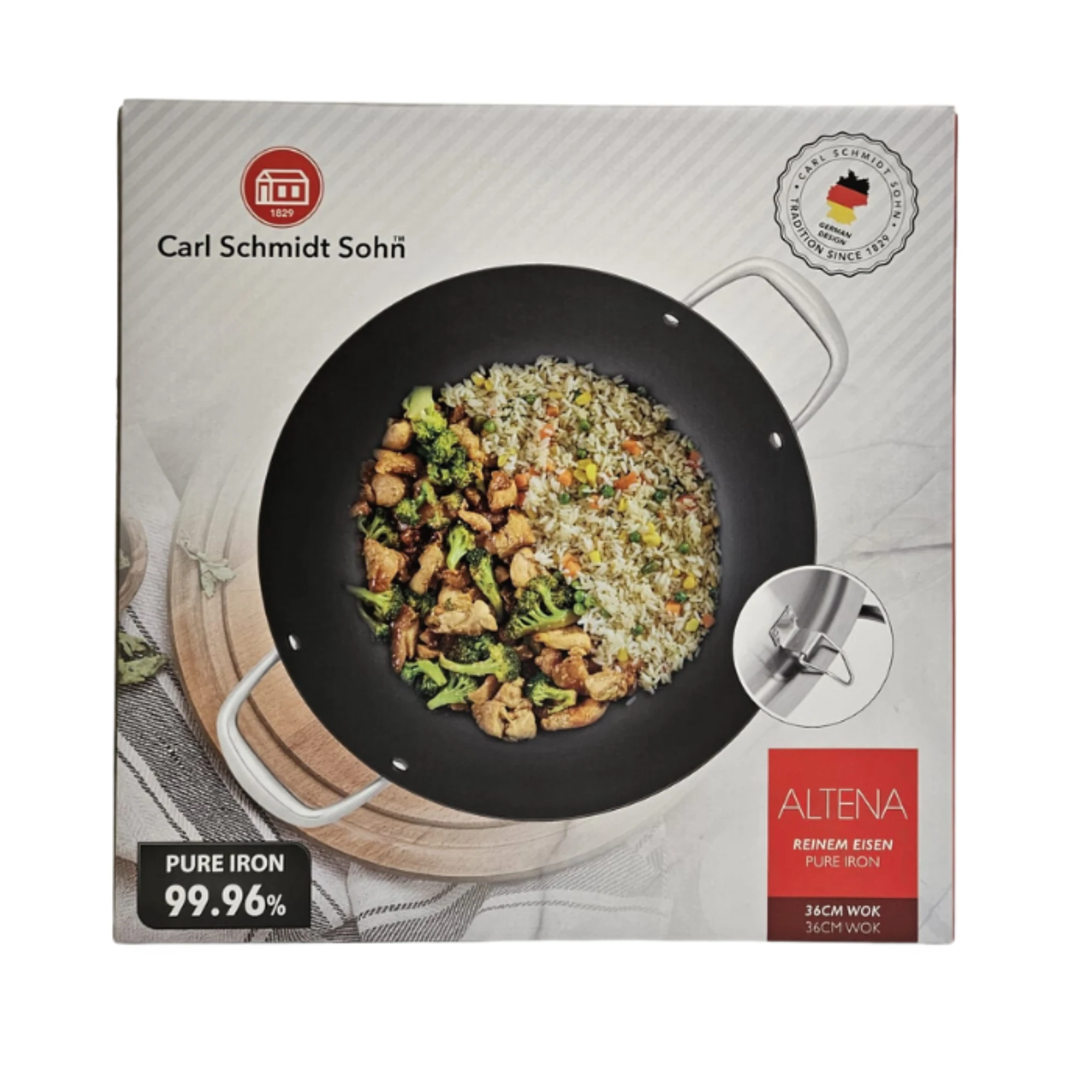De ALTENA serie van Carl Schmidt Sohn is speciaal ontwikkeld voor professioneel gebruik: de wokpan met een diameter van 36 cm combineert robuust gietijzer met een doordacht ontwerp om aan de wensen van horeca‑ en cateringkoks te voldoen. Volgens de fabrikant is het materiaal vervaardigd met een ijzergehalte tot 99,96 %, wat zorgt voor minder onzuiverheden en dus een gezonder kookresultaat.