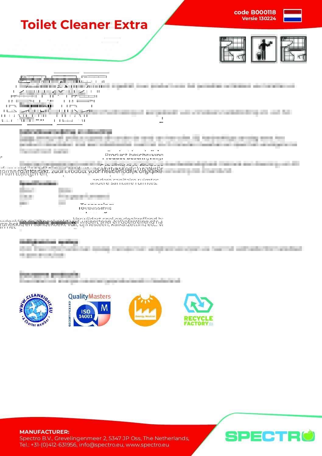De Toiletreiniger Extra is duurzaam en energieneutraal geproduceerd in Nederland en bevat orthofosforzuur (pH 1,0), een krachtig werkzame stof.