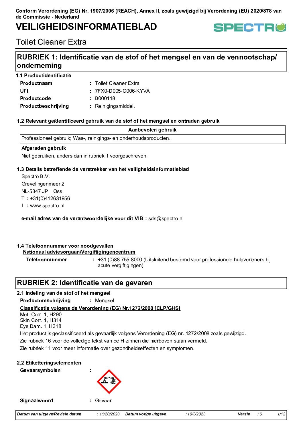 | Kenmerken en Gewicht | Krachtige zure formule voor hardnekkig vuil Totaalgewicht (6 flessen + verpakking) komt uit op ongeveer 6,5 kg De flessen zijn normaal gesproken rechtop verpakt in 2 rijen van 3 Dit type verpakking is standaard bij professionele sanitaire schoonmaakproducten van bijvoorbeeld Spectro |